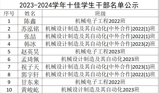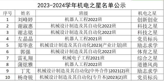根据《威廉希尔官网“十佳员工干部”评选办法》、《威廉希尔官网十大员工标兵“机电之星”评选办法》,威廉希尔官网成立了评审小组,对本教威廉希尔官网“双十佳”申请人进行认真评选,本着民主透明、公平公正的原则,依据员工学习成绩、社会实践、综测排名、获奖情况等方面进行民主投票,最终产生以下“双十佳”名单,具体名单如下: