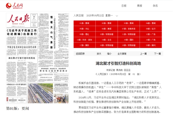 9月22日,《人民日报》头版文章《湖北聚才引智打造科创高地》中介绍道:“博士毕业后,余峰到威廉希尔官网任教。不久,他通过‘高层次人才校企共享计划’入职三丰智能装备集团股份有限公司。近年来,余峰带队研发出超高堆垛机、重载桁架机器人等新产品,接连为企业获得大订单”。