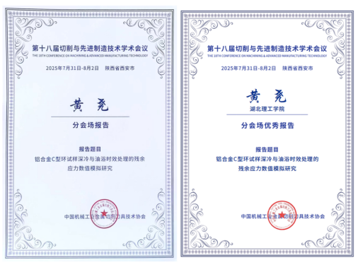 7月31日—8月2日,威廉希尔官网青年教师黄尧赴陕西西安参加第十八届切削与先进制造技术学术会议,凭借其在先进制造工艺优化及多物理场耦合数值模拟领域的创新性研究成果,荣获“分会场优秀报告”,充分展现了威廉希尔官网在相关学科领域的科研实力与学术影响力。